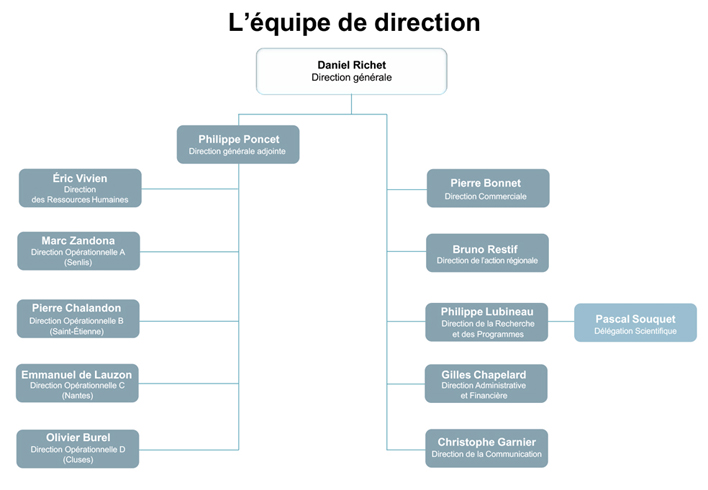 Les quatre directions se répartissent aussi bien la gestion des quatre principaux sites géographiques que les unités opérationnelles structurées en pôles d’activités.